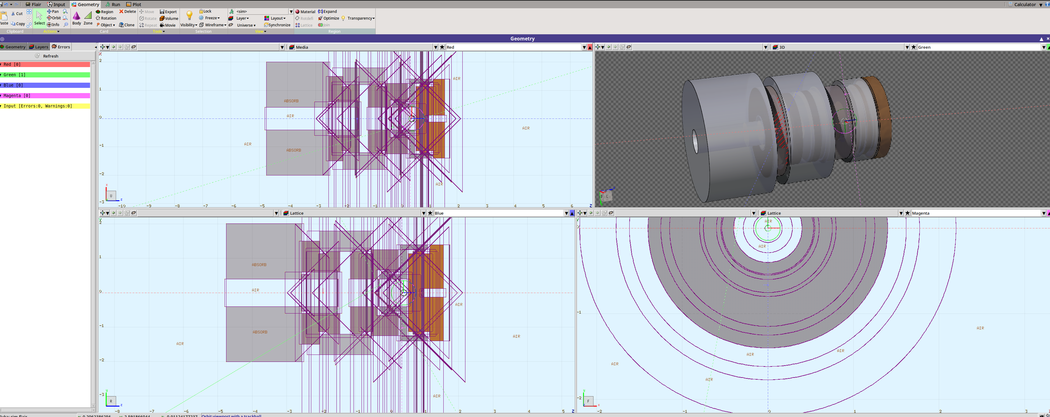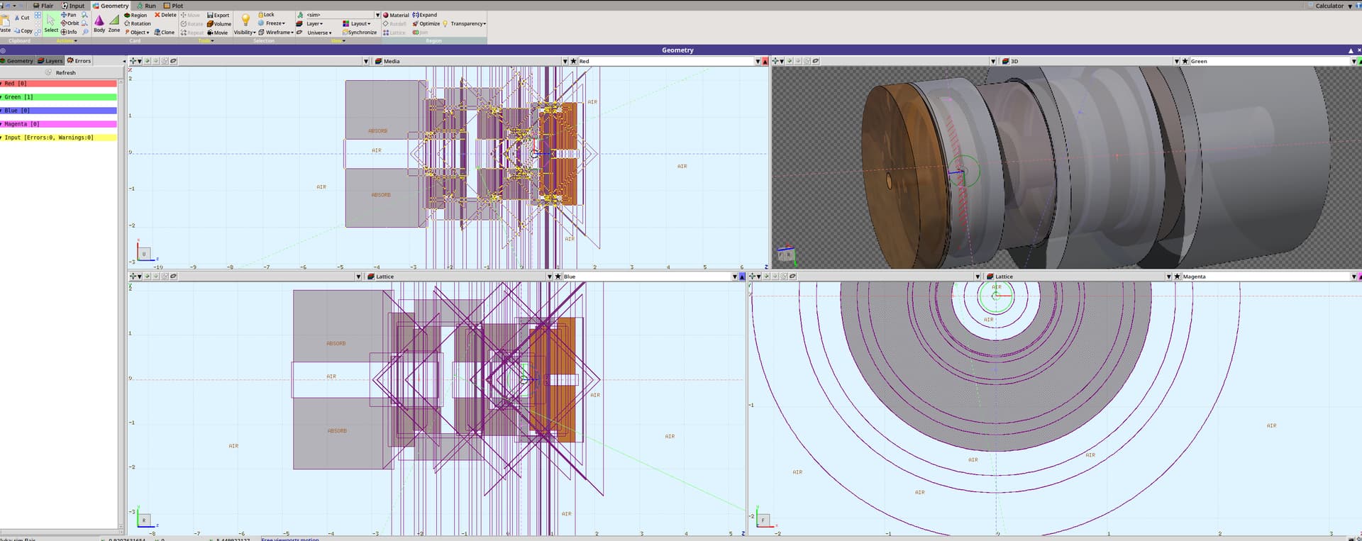 The biggest problem is that I cannot see these errors in other layouts, so I cannot fix them. The assembly has axial symmetry along the z-axis, so theoretically, I should see the errors in the xz- and yz-projections as well. I tried to move the magenta viewport line along the z-axis to catch the errors on the xy-slice, but I didn’t find anything. So, I don’t understand where the errors come from or what causes them. I checked all the zones near the problematic areas in hopes of finding overlaps, but everything seems fine. Also, it seems that the .err files don’t contain errors, and the simulation runs without any problems.