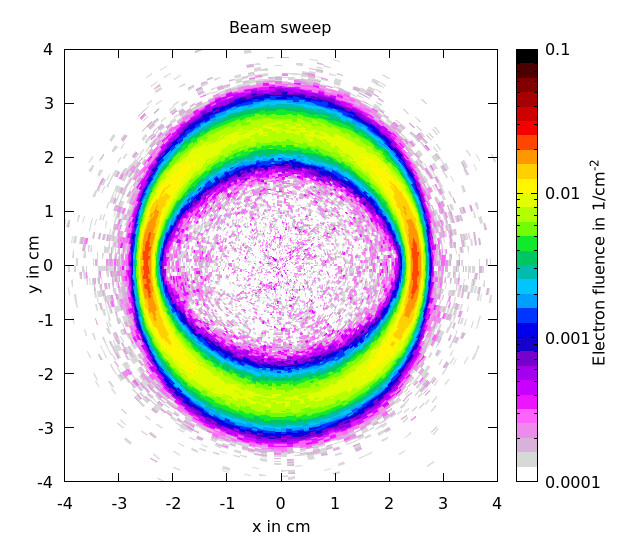Dear FLUKA experts, I have a beam that sweeps around a circle, and the beam spot follows a Gaussian distribution. I want to calculate the energy deposition for the subsequent thermal safety analysis. May I ask if this definition of beam current is appropriate? The sweep radius is 2.5cm.