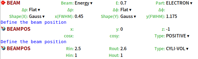 To answer your second question first: if you work with the BEAMPOS card using CYLI-VOL, the starting positions are sampled uniformly in the region between Rin and Rout. This does not represent a Gaussian beam spot, so for a Gaussian spot sweeping along a circle your user-written source is the recommended approach.