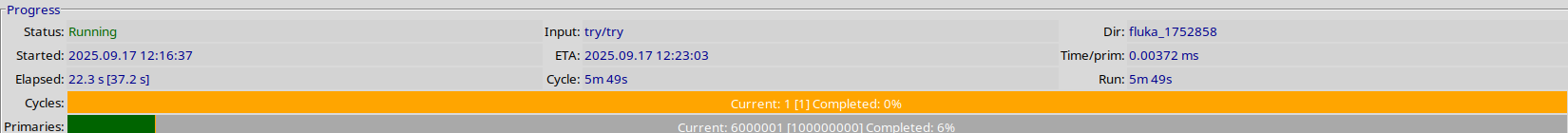Also, please note that it seems your source it at the edge of the black hole region. We advise that you shift it a little bit to your simulation volume so it is less ambiguous for FLUKA. This could also be the reason why the simulation is stuck. Have you also tried running with fewer primaries? It could be that with 10^8 primaries the progress is so slow that Flair does not have time to update. Reduce this number so it finishes in a few minutes or seconds.