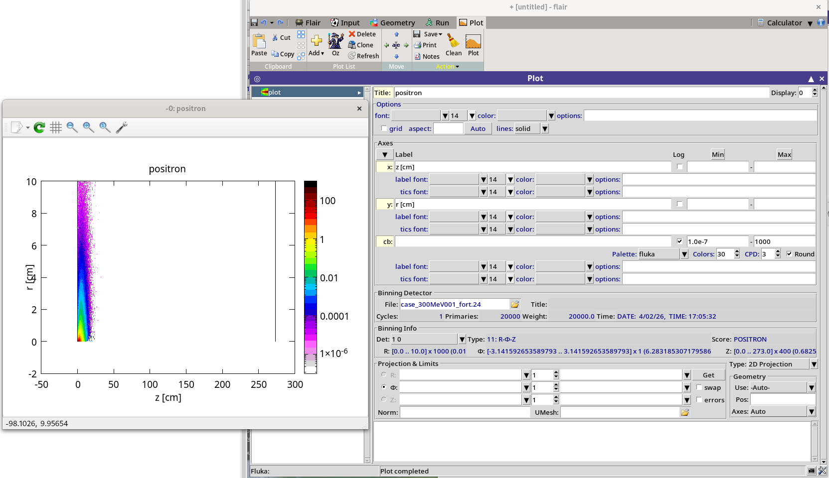 Is our simulation really finished? The beam terminates (stops) quickly at ~25 cm. I suspect that the life time of the particles is not long enough for them to fully pass the long target. Maybe I am very wrong.