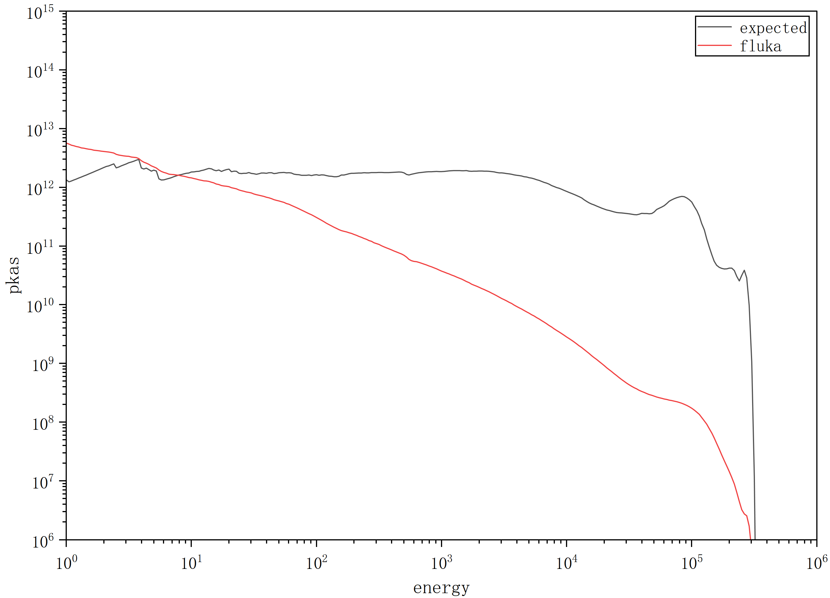 Recently, when calculating PKA energy spectra using mgdraw.f, my post-processing of the raw data is as follows: I bin the obtained PKAs into corresponding energy regions based on a predetermined energy grid; then divide by the product of my simulation particle count and number of cycles, multiply by the total flux of the incident neutron spectrum, and divide by the target volume. The resulting PKA counts in the high-energy region are far lower than expected. What could be the possible reasons?